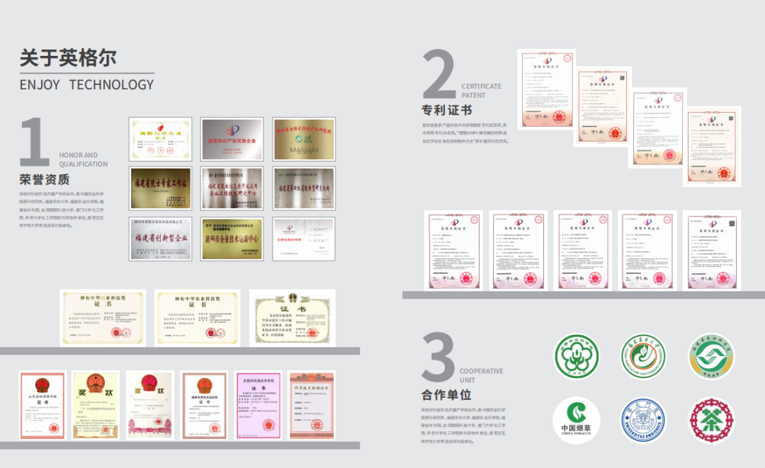 廿载耕耘,硕果累累。公司先后获得国家级科技进步奖1项,神农中华农业奖2项,全国农牧渔业丰收奖1项,省级科技进步奖6项(其中一等奖3项),市级科技进步奖2项。获得专利100多项,其中发明专利10项。凭借卓越的技术实力与产品品质,英格尔科技的产品远销海内外,助力全球农业绿色转型。
